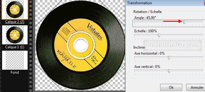 4.Clic droit sur la vignette du calque 2 > Transformation Paramétrée: Angle = 45,00° ( servez-vous des flèches du clavier pour avoir ces chiffres)