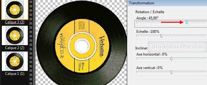 7.Clic droit sur la vignette du calque 3 > Transformation Paramétrée: Angle = 45,00° ( servez-vous des flèches du clavier pour avoir ces chiffres)