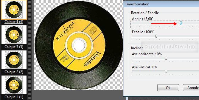 10.Clic droit sur la vignette du calque 4 > Transformation Paramétrée: Angle = 45,00° ( servez-vous des flèches du clavier pour avoir ces chiffres)