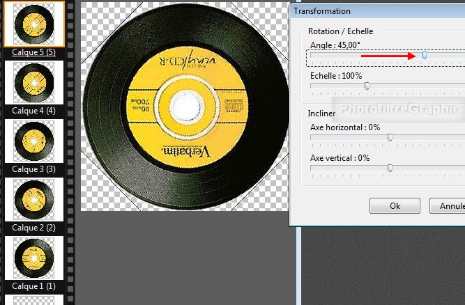 13.Clic droit sur la vignette du calque 5 > Transformation Paramétrée: Angle = 45,00° ( servez-vous des flèches du clavier pour avoir ces chiffres)