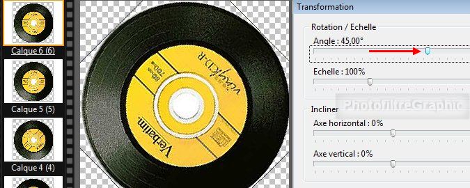 16.Clic droit sur la vignette du calque 6 > Transformation Paramétrée: Angle = 45,00° ( servez-vous des flèches du clavier pour avoir ces chiffres)