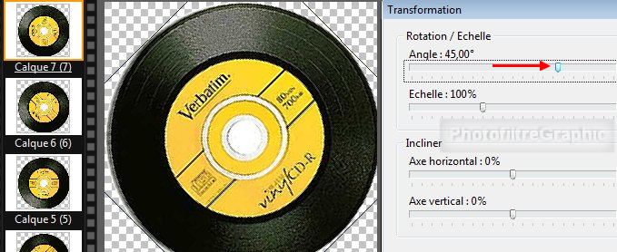 19.Clic droit sur la vignette du calque 7 > Transformation Paramétrée: Angle = 45,00° ( servez-vous des flèches du clavier pour avoir ces chiffres)