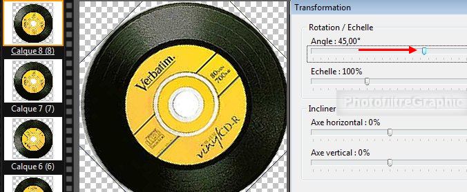 22.Clic droit sur la vignette du calque 8 > Transformation Paramétrée: Angle = 45,00° ( servez-vous des flèches du clavier pour avoir ces chiffres)